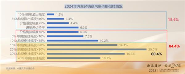 汽车经销商近两年的日子确实不好过。此前,中国汽车流通协会副秘书长朗学红提到,2024 年,有 84.4% 的汽车经销商有不同程度的价格倒挂,60.4% 的汽车经销商价格倒挂幅度在 15% 以上。