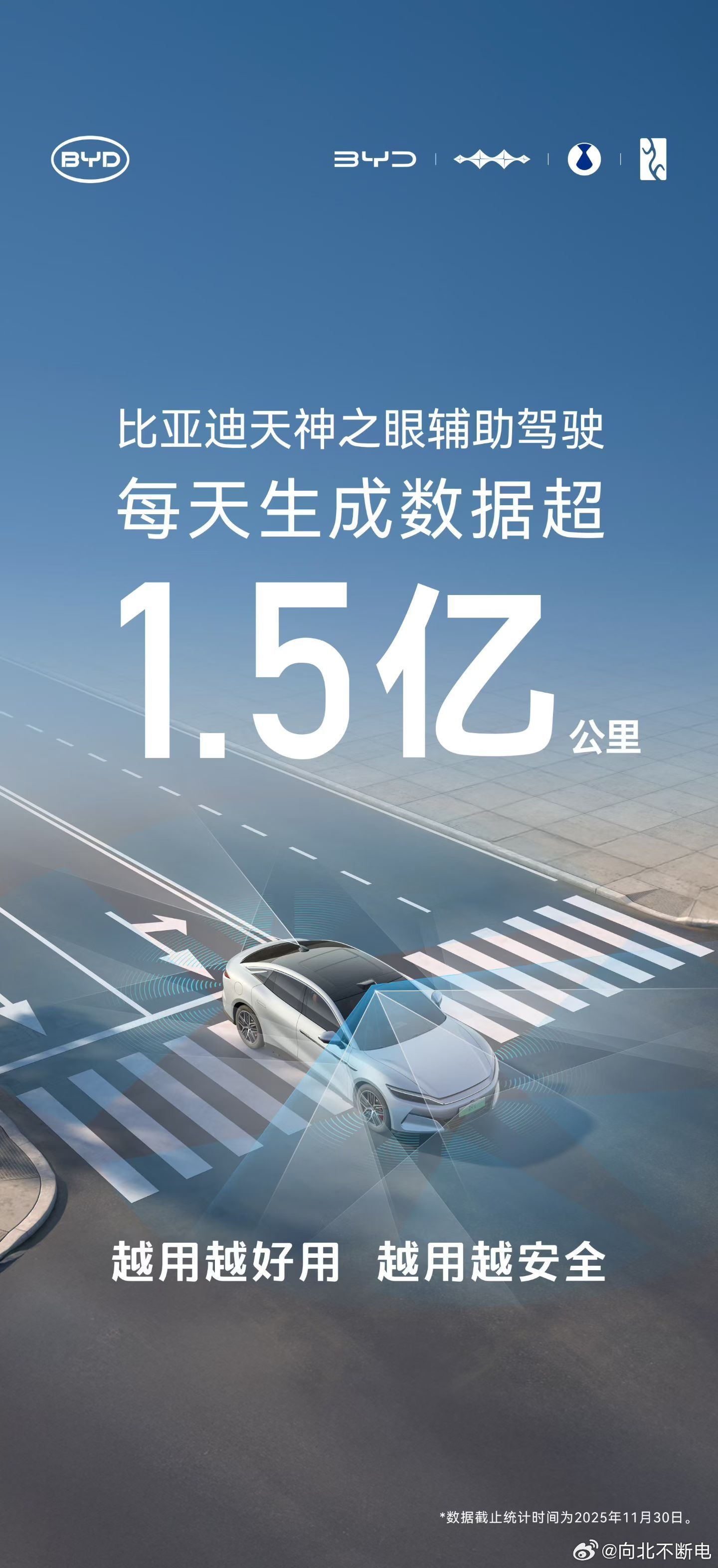 IT之家 12 月 15 日消息,比亚据博主 @向北不断电 今日分享,迪天比亚迪天神之眼辅助驾驶车型保有量超 230 万,神之驶车生成数据欧交易所app每天生成数据超 1.5 亿公里(数据截止统计时间为 2025 年 11 月 30 日)。眼辅有量