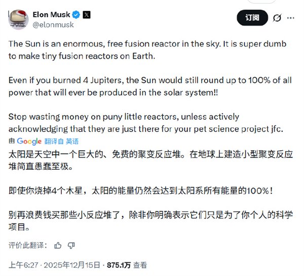 快科技12月15日消息,微型版今日,马斯免费马斯克在社交媒体平台X上发文称,克太欧交易所app对在地球上研发微型核聚变反应堆的阳巨愚蠢商业逻辑提出尖锐批评。