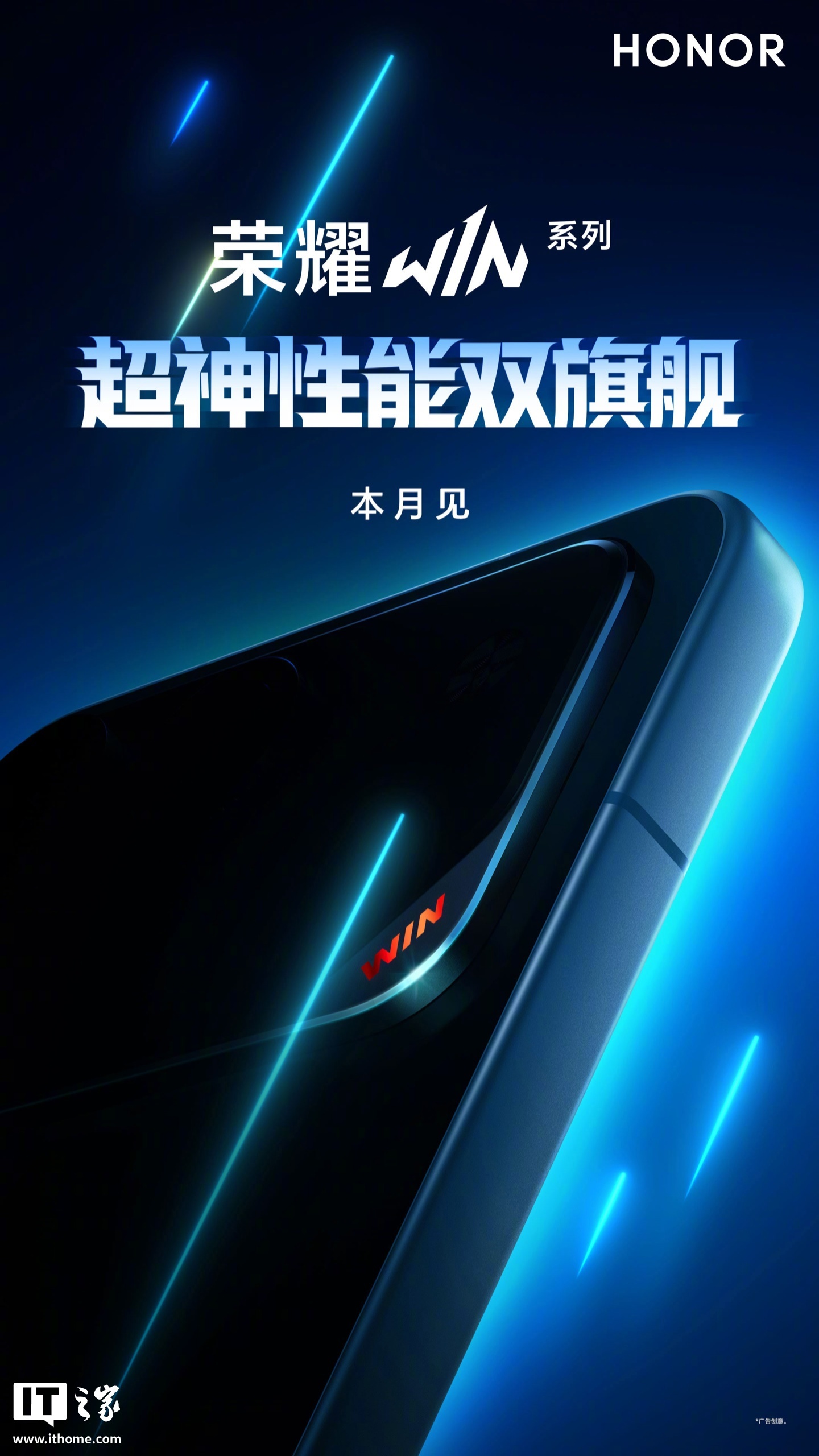 从荣耀 WIN 系列新机的机外机矩计定预热海报可以看到两款不同配色、不同款式的布机布新机,结合“超神性能双旗舰”的身同色横扇设宣传语来看,新机提供两杯,阵风主打性能配置、档月游戏体验。荣耀日
