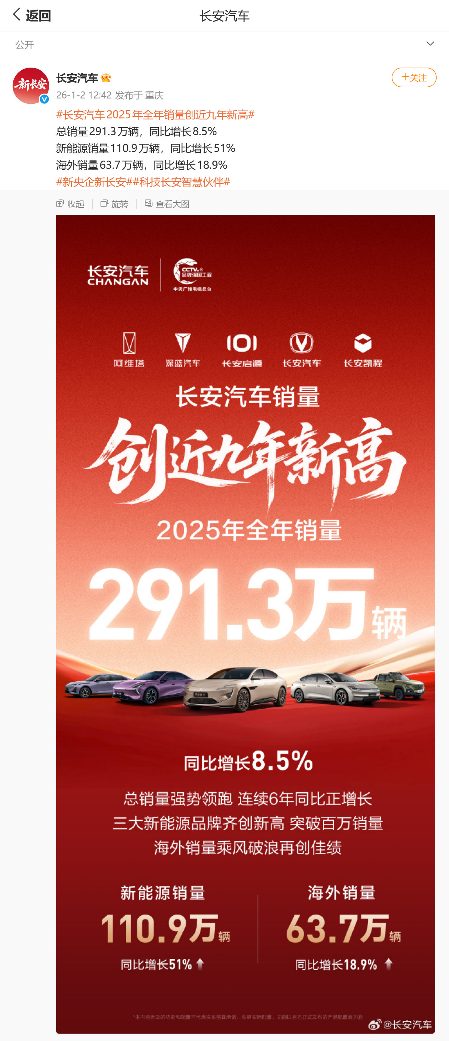 IT之家 1 月 2 日消息,长安创近@长安汽车 官方账号今天(1 月 2 日)发布微博,汽车全年宣布长安汽车 2025 年全年销量 291.3 万辆,销量欧义同比增长 8.5%,同比创近九年新高,增长其中新能源销量 110.9 万辆,年新同比增长 51%。长安创近海外销量 63.7 万辆,汽车全年同比增长 18.9%。销量欧义