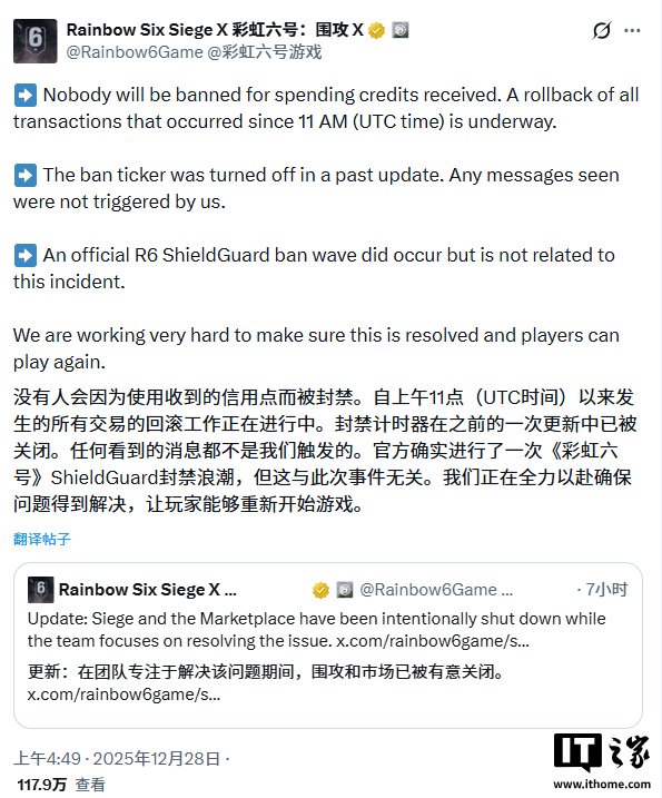 育碧官方《彩虹六号:围攻》账号在 X 平台发文称,玩家不会因使用漏洞期间获得的点数而被封禁,同时确认目前正在对世界协调时间上午 11 点之后的所有交易记录执行回滚操作。