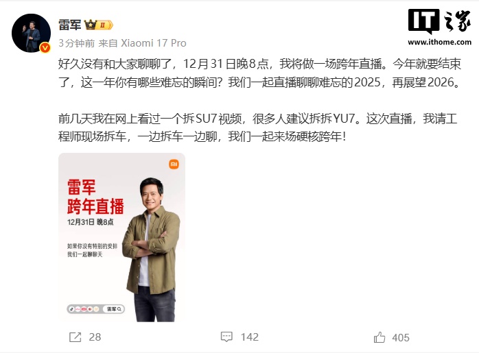 IT之家注意到,雷军去年 12 月 31 日也举行过围炉跨年直播活动,与网友分享年度难忘时刻。