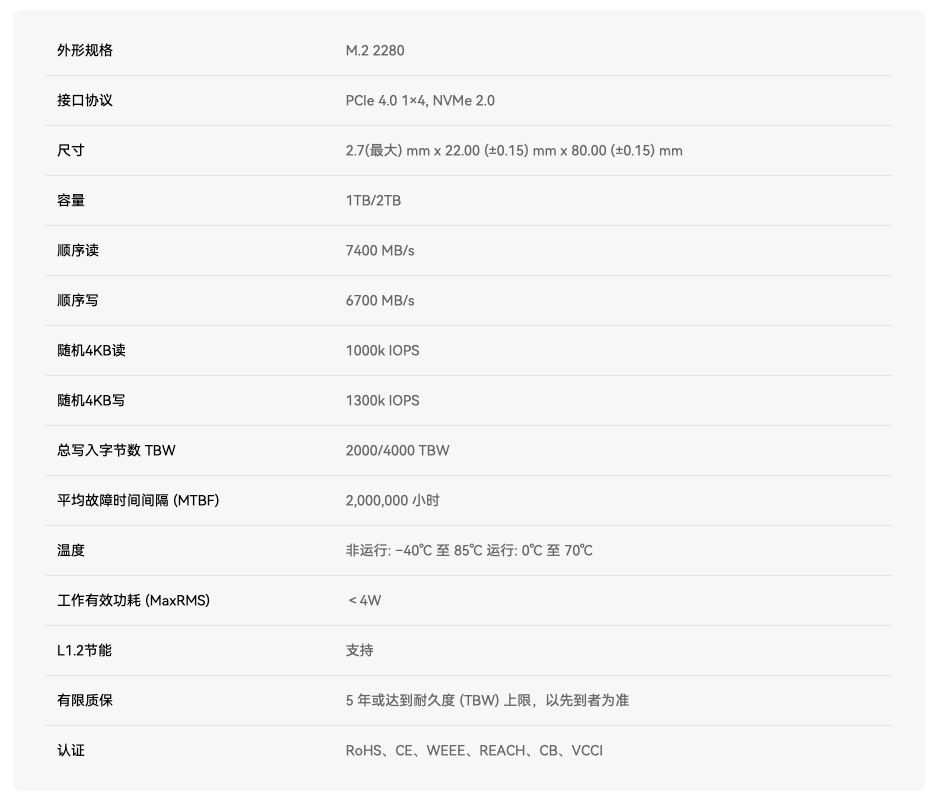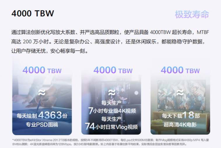 标称耐久度,达到了 1TB/2000TBW、2TB/4000TBW。