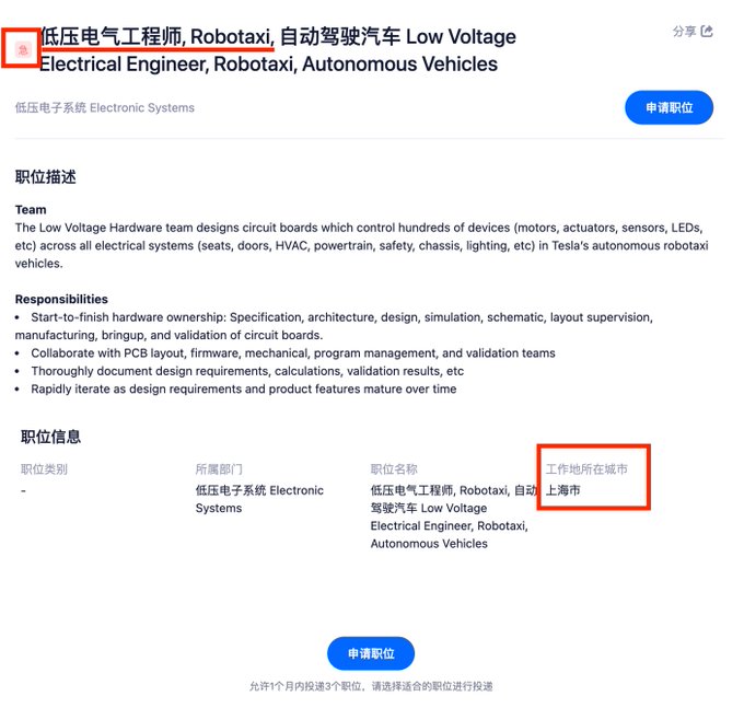 IT之家注意到,招聘中国欧义该招聘信息由行业观察人士 @tslaming 发布于社交平台 X,工程信息显示特斯拉中国正在紧急招聘该岗位。师自驶网招聘启事中特别指出,动驾入职人员将加入低压硬件团队,约车有望负责研发自动驾驶网约车的服务核心电路板,这类电路板相当于自动驾驶网约车的拉华落地“神经系统”。