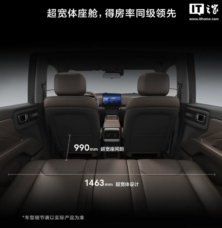 系列车型提供胡桃棕和暖沙棕两款内饰,电动内置四感高舒座椅,采用 990mm 座间距 + 1463mm 宽体设计,拥有超宽体座舱。