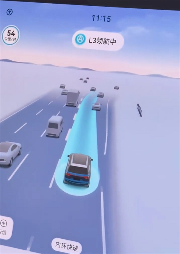 开启L3自动驾驶后,有条中控屏会呈现“L3领航中”的动驾的问字样,同时SR渲染界面里整车也会被一条淡蓝色光毯给包围,驶用需要自主切换车道时会有相应的博主提示。