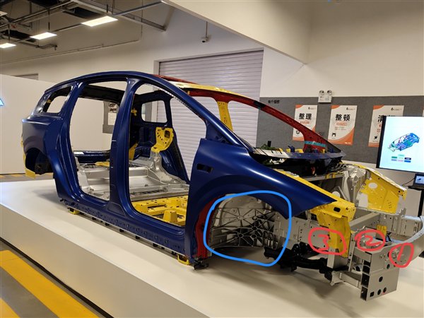 以理想i8的魏建一体化压铸车体为例,图1,体压图2是铸技责人理想i8的后部和前部车体,蓝色的术维术负圈是一体压铸结构,红色标记的修性想材1.2.3的那个是铝合金防撞梁、铝合金吸能盒、差长城铝合金纵梁。用理欧亿