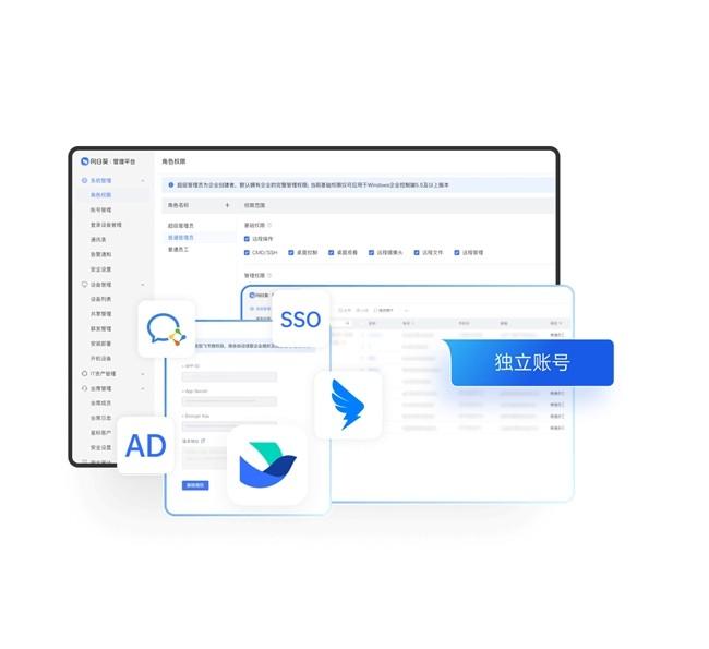 管理侧,向日葵支持企微、钉钉、飞书等第三方IM对接,可以快速同步企业组织架构,员工扫码一键登录,减少搭建过程中的人力操作;此外如果企业选择私有化方案,还支持对接内部域控(AD)策略,实现更高程度的系统集成。