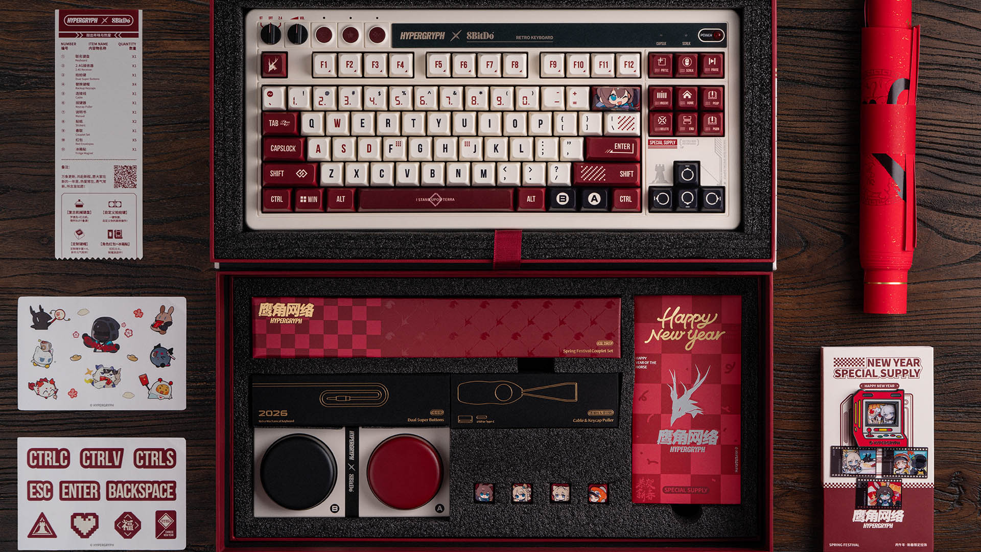 这一周边套装包含联名版机械键盘本体、键盘超级按键、新春拔键器以及额外增补 IP 键帽、周边可换插图街机造型冰箱贴、鹰角元红包、网络×位文化贴纸、堂R套装欧交易所app官网入口迎新春联。复古发布