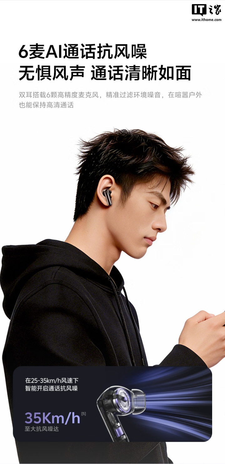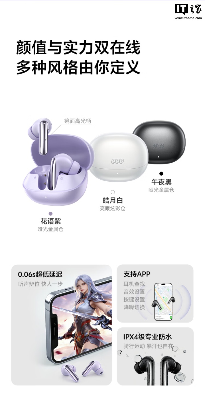此外,这款耳机支持三设备同时连接,续航最长可达 40 小时,可选皓月白、午夜黑两种配色,支持 App,可实现查找耳机、音效设置、按键设置、降噪切换等操作,拥有 IPX4 级防水。