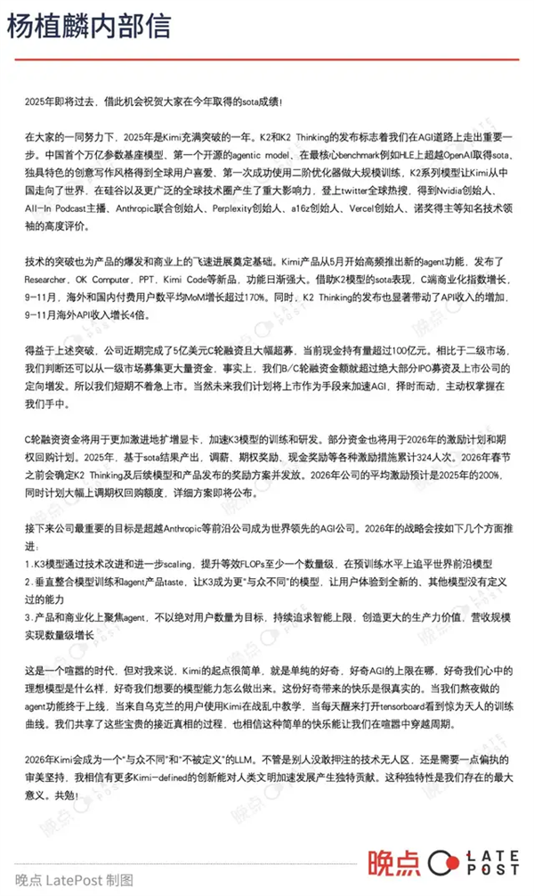杨植麟年终内部信曝光:欧亿月之暗面完成5亿美元新融资 账上资金超百亿元