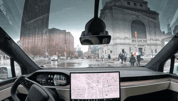 要知道这是在雨水冲刷导致道路标线几乎消失的情况下,足以证明这套统对车道和转向线的识别能力甚至优于人类驾驶员。