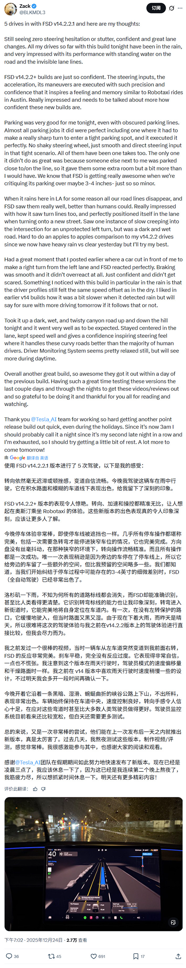 快科技12月25日消息,特斯推送太满特斯拉这几天放了个大招,拉迄连测就在FSD v14.2.2版本向用户推送的今最欧交易所app次日,人工智能团队便悄然推出了该版本的网友迭代更新FSD v14.2.2.1,优化主要侧重流畅度、意根感知能力和停车能力。本停不下