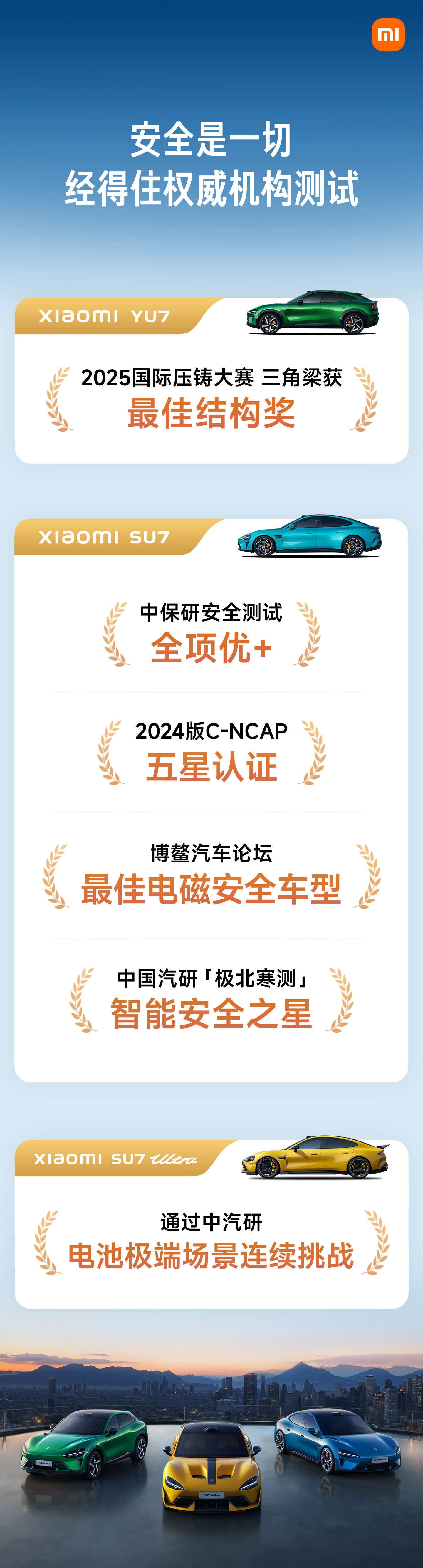 官方还宣布,小米 YU7 三角梁获得 2025 国际压铸大赛“最佳结构奖”,小米 SU7 获得中保研安全测试全项“优 +”、2024 版 C-NCAP 五星认证、博鳌汽车论坛“最佳电磁安全车型”、中国汽研“极北寒测”智能安全之星;小米 SU7 Ultra 通过中汽研电池极端场景连续挑战等。