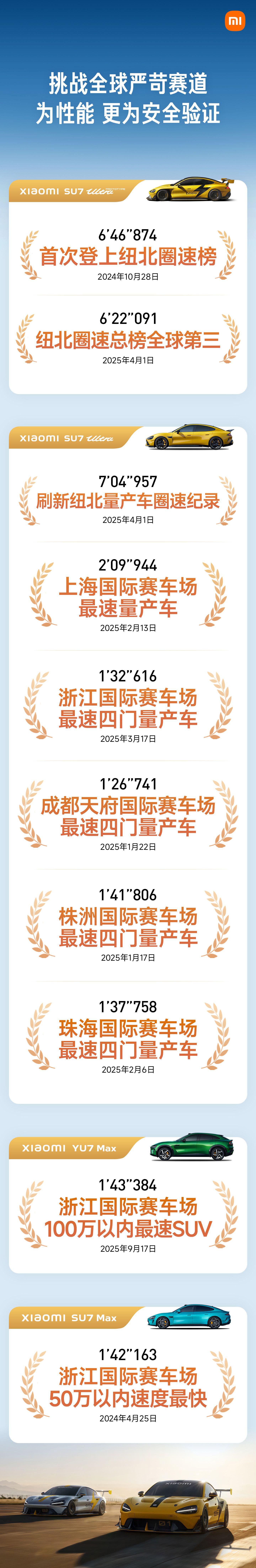 小米 SU7 Ultra 原型车于 2025 年 4 月 1 日以 6 分 22 秒 091 的成绩登上纽北圈速总榜全球第三,量产版则以 7 分 04 秒 957 刷新纽北量产车圈速纪录,并成为上赛、浙赛、成都天府国际赛车场、株洲国际赛车场、珠海国际赛车场等赛道最速四门量产车。